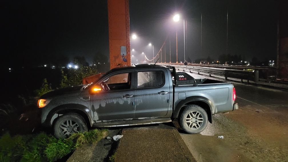 En el lugar, una camioneta doble cabina, luego de impactar la barrera de contención del puente, quedó totalmente cruzada en dirección hacia la calle Teniente Merino, sector más bien conocido como Camino Viejo.